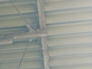 会社のプレハブ骨組みにキジバトが来て、たまごをあたためております❗
