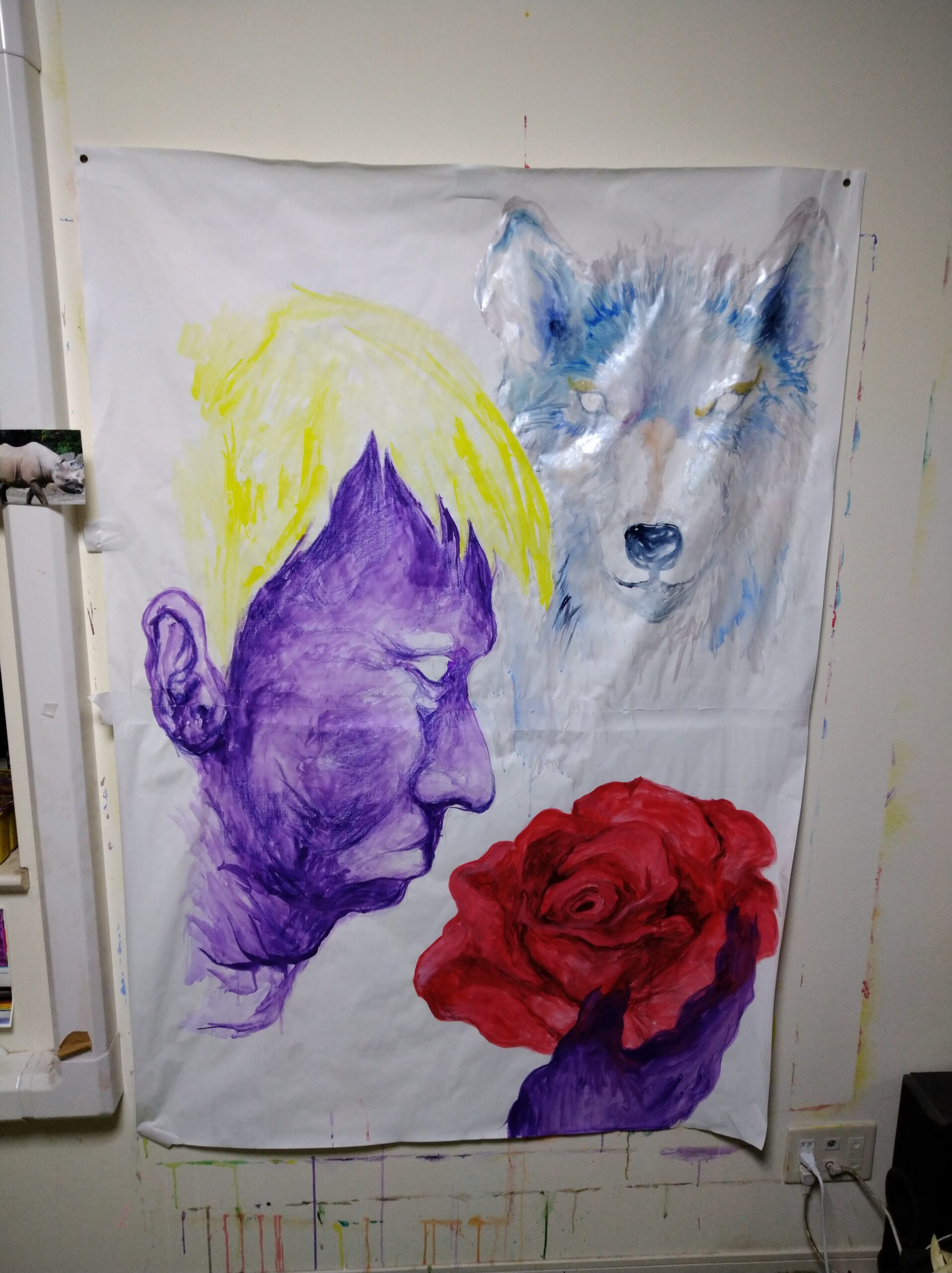 いや、ここの箇所をジェッソで消したら、なんだか、こっちのほうがいいじゃん! よし、これでいこう、ジェッソのホワイトが、霧のようにみえて、より、技巧的にみえてきたよ!