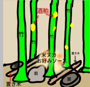 竹と竹の間に、ヌカをまき、図のように、やりましょう。