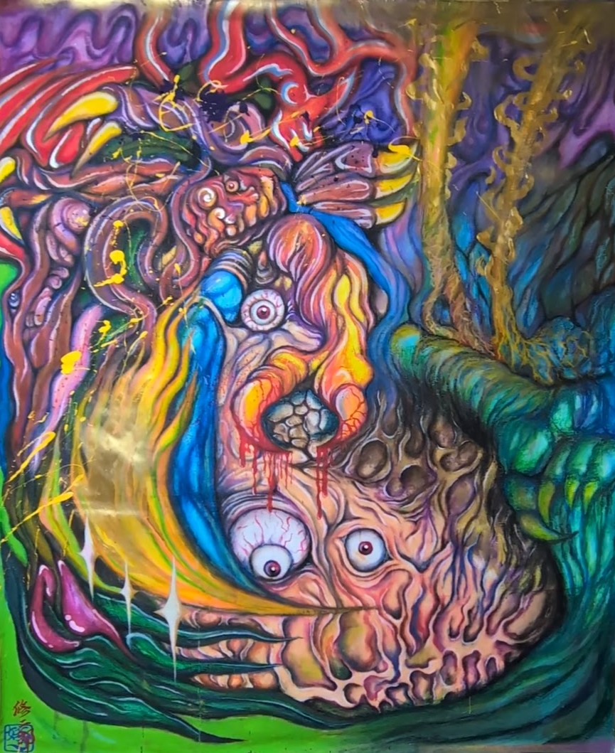 穴の中から這い出てくる得体のしれぬ生き物を描き始めていますと、去年、会社で、ほぼ壊滅的な出来事があり、大袈裟にも、死しても尚お、みたいな意識が、絵のなかにも自然と顯れたようです。左側の瀕死な様子の化け物が、それを物語り、上部の血の雨のようなものも、妖奇的な、残忍な、不気味な背景色を、滲ませております。泥々とした、くねり曲がった触腕は、また一方で、作詞の爽快な心魂を、素直に現した絵画描写一徹であります。作者は、くねくねしたつるつるしたぶにゅぶにゅしたような物体を嗜好するのです。中央に飛び出したような魔性の生き物とやらは、何を隠しましょう、これこそが、ヴェドロなのです。ヴェドロとは、私は、後に、「狂った念」と名付けました。狂念、です。このヴェドロが、ある小屋で、このように、私を、不敵な笑みを浮かべて、反面、本人も、死の淵へ足を突っ込んだような恐怖に駆られた面相をしているとも観られます。妖界から誘われし表形の手足を、小屋の奥穴から這いずり出て、私を待ち構えています、いえ、狂襲しようとさえみれます。右側には、雷鎚の光線を発動し、きらびやかにも、いかり狂った風にも、見受けられます。正しく、化け物に相応しい様相をしたヴェドロが、私を待ち構えていました。しかし私は、なぜ小屋にしたのか!?と、問われますと、それは、仕事で、ある男と知り合ったのですが、その男が、山深い場所に、帰る小屋があるのです。その小屋から取りました。小屋に、私も行ってみたい、と思った深層心理があるのかもしれません。